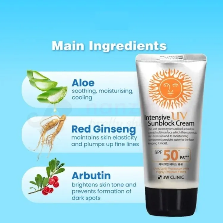 3W Clinic Intensive UV Sun Cream – সাশ্রয়ী দামে ত্বকের জন্য perfect protection! UVA/UVB rays থেকে রক্ষা করে, melasma ও fine lines কমাতে সাহায্য করে। Aloe extract ত্বককে deeply moisturize করে এবং irritation soothe করে। Makeup base হিসেবেও ব্যবহার করা যায়, সব ধরনের skin-এর জন্য উপযুক্ত।