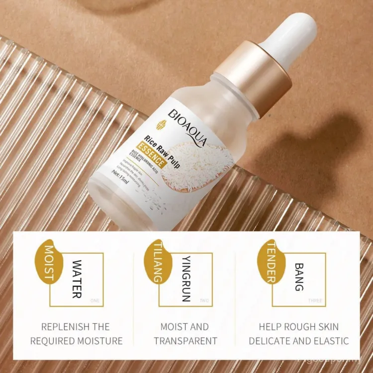 The Bioaqua Rice Raw Pulp Serum 15ml is a powerhouse skincare product designed to transform your skin, available at an affordable price of BDT 260 in Bangladesh. This lightweight serum is formulated to hydrate, brighten, and rejuvenate your skin, making it a perfect addition to your daily skincare routine. Packed with rice-derived ingredients, it works to enhance skin elasticity, minimize pores, and reduce dark spots, acne scars, and blemishes. The bioaqua rice raw pulp serum benefits include delivering a radiant, glowing complexion while keeping your skin soft, smooth, and moisturized throughout the day. Its non-greasy formula absorbs quickly, providing deep nourishment without clogging pores. The serum also offers protection against sun damage and skin inflammation, making it suitable for all skin types. For optimal results, apply 2–3 drops at night on clean skin. Whether you’re combating dullness or seeking a flawless look, this serum is a game-changer. Stay updated with the latest skincare trends by following us on Facebook. Explore more at Nanziba’s Pretty Shop for radiant skin solutions.
